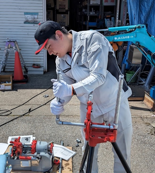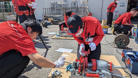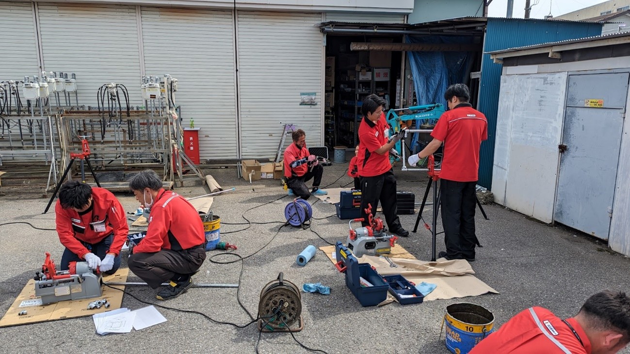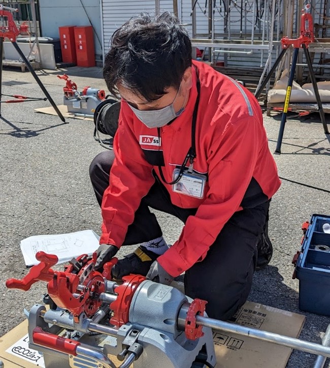 本日、当社本店にて液化石油ガス設備士の資格取得に向けた社内講習が開かれました。 講習では、当社社員が講師となり、参加者はLPガス配管工事を行うためのねじ切り機を使用して、配管組み立てや漏洩検査を行いました。