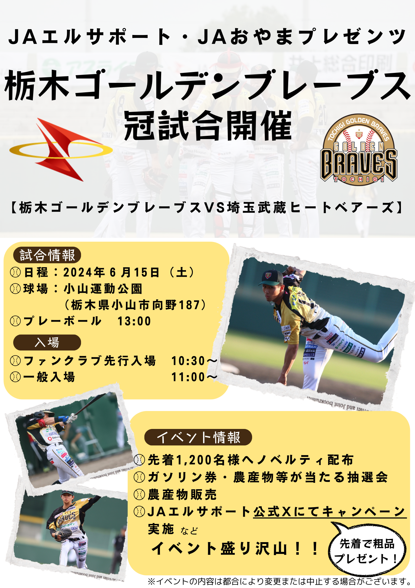 JAエルサポートがOFFICIAL PARTNERを務める栃木ゴールデンブレーブスの冠試合をJAおやまと共催で開催いたします!🔥