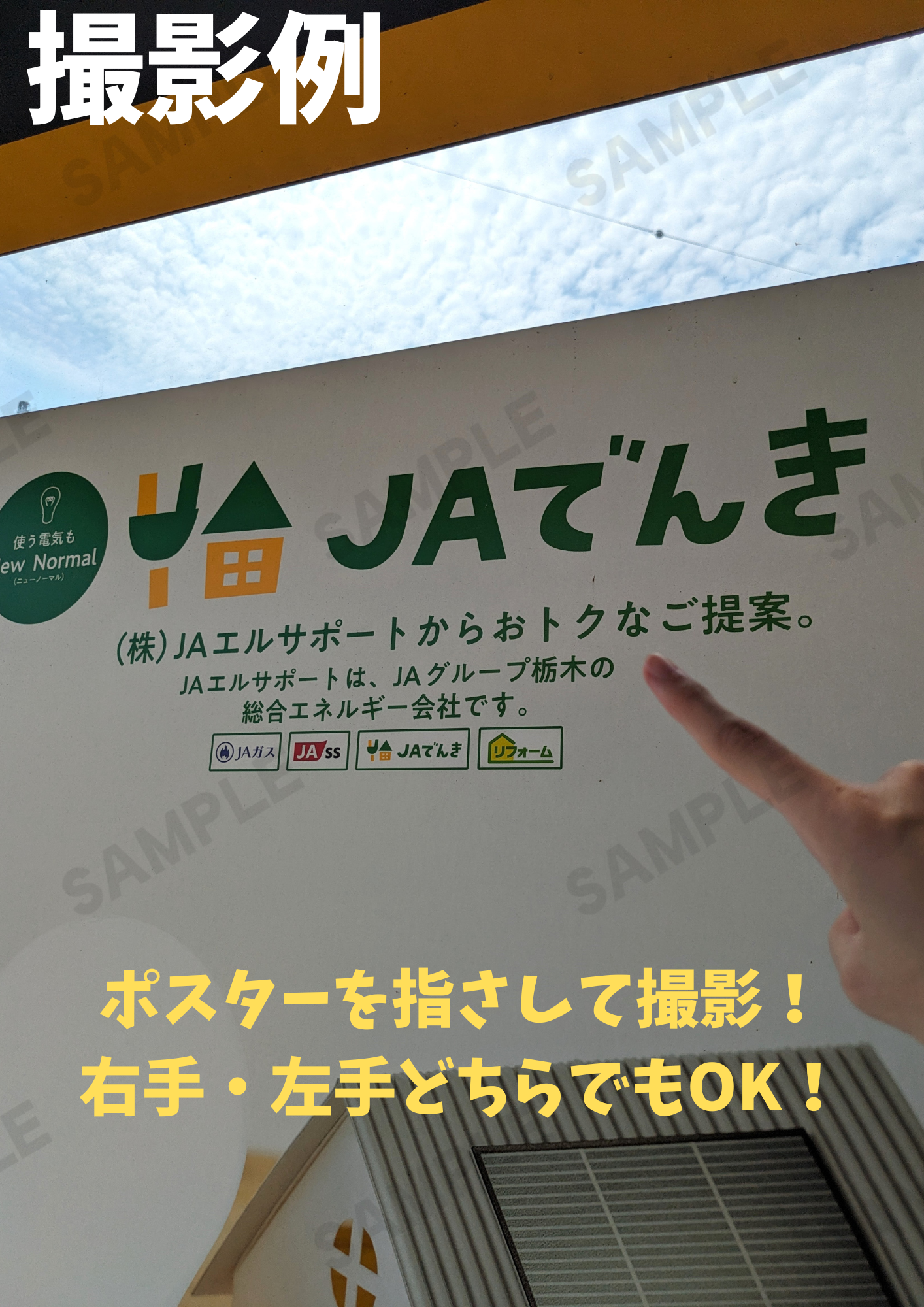 期間中、栃木県内のどこかのLRT停留所に掲示してあるJAでんきのポスターを探して下記画像を参考に写真を撮影し、『#JAでんきおすすめ』を付けて投稿+JAエルサポート公式Xをフォローいただいた方から抽選で10名様へJCBギフトカード5,000円分をプレゼントいたします。