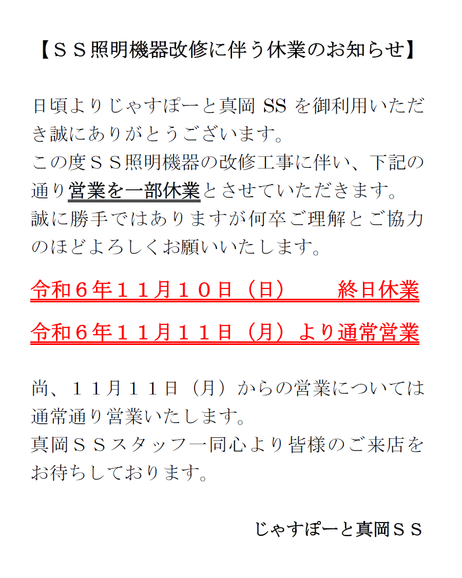 【じゃすぽーと真岡SS】照明機器改修に伴う休業のお知らせ